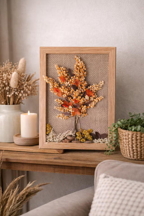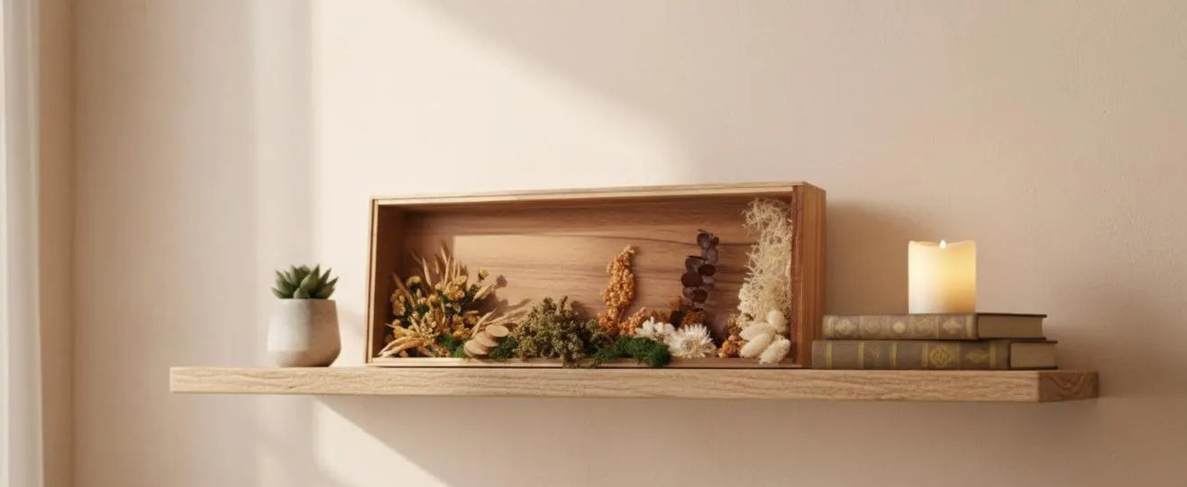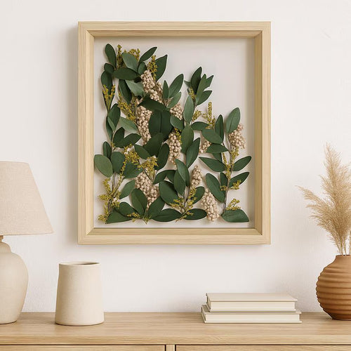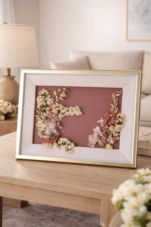 Trabajamos con flores secas reales, elementos botánicos naturales y marcos de madera. Todos los materiales se seleccionan cuidadosamente para garantizar durabilidad y belleza.