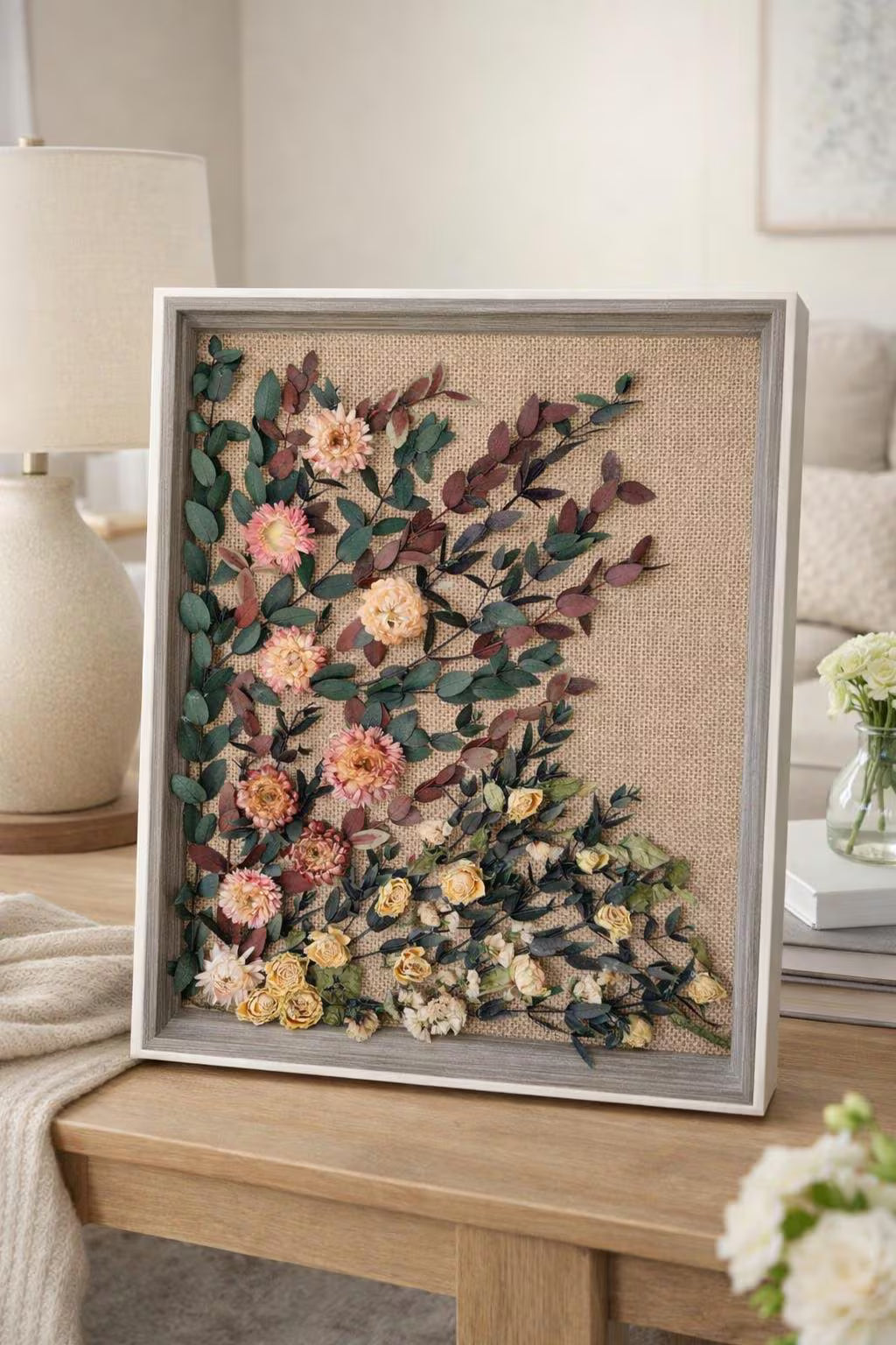 Cada obra se crea de forma artesanal con flores secas y materiales naturales. No hay dos piezas iguales.